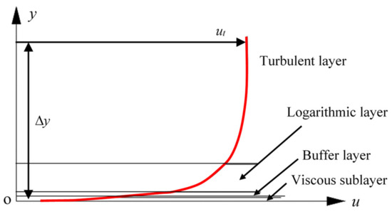 If the SST turbulence model was applied, the automatic-wall treatments [6] were also adopted, to empirically model the near-wall flow. As shown in Figure 1, the red line in the figure is the change curve of fluid velocity with the distance from the wall. The near-wall-flow region included 3 main parts: the viscous sublayer, buffer layer and logarithmic layer [31,32]. In the viscous sublayer, there is [33]: