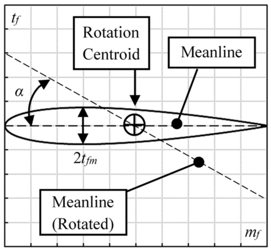 Thus, the maximum thickness, tfm, approximately locates at mf/c = 0.3. The incidence angle (between the meanline and rotated meanline) can be denoted as α, the unit representing a degree. It represents the foil-rotation status, based on the rotation centroid.