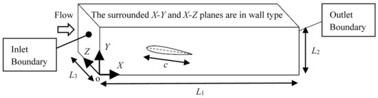 In this study, the NACA0015 foil was studied at α = 8 degrees inside an L1 × L2 × L3 cuboid domain, as shown in Figure 4. L1, L2 and L3 were respectively equal to 4.35c, 1.04c and 0.70c. Coordinate components X, Y and Z denote the three orthogonal directions, where X is along the flow direction, Y is perpendicular to the flow direction and Z is along the foil span. Because the foil does not change shape and scale along Z, this 3D case can be treated as an X-Y quasi-2D case, which provides a good case simplification. Fluid flows into the domain at the inlet boundary and out of the domain at the outlet boundary. The four surrounding X-Y and X-Z planes are walls.