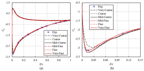 Pressure on foil surface under different mesh schemes. (a) Cp distribution on foil surface along X direction; (b) Enlarged view within X/c = 0~0.15 and Cp = −0.5~−3.5.