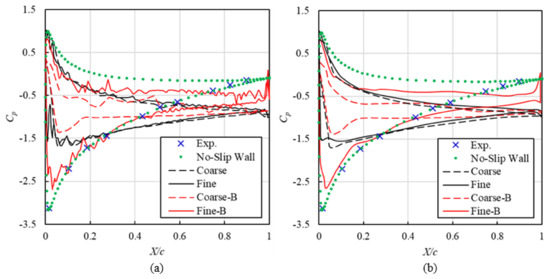 Figure 6a shows the pressure on the foil surface under different mesh-scheme combinations. The pulsations can be observed on the immersed-solid predicted Cp curves. These pulsations could be caused by the data interpolation on the fluid–solid interface. Thus, the smooth procedures [36] were conducted to create Figure 6b. The No. 1 combination had the same density as the selected No. 5 mesh in the no-slip-wall case. However, it produced a completely wrong Cp curve, compared with the no-slip-wall case and the experimental data. Therefore, the mesh density was refined to No. 2, but no improvement could be observed. Based on the two results, the boundary tracking was set to near-wall approximations on the immersed solid on the fluid side. The “Coarse-B” curve still produced wrong data. On the other hand, the “Fine-B” curve showed an obvious improvement, in that both the leading-edge pressure rise and drop were correctly captured in position. The amplitude of the maximum and minimum Cp values became closer to the experimental data. Therefore, the other flow characteristics will be analyzed in the next section.