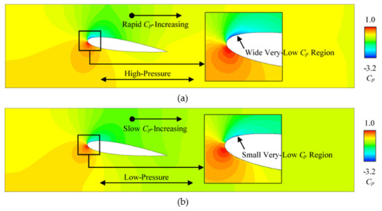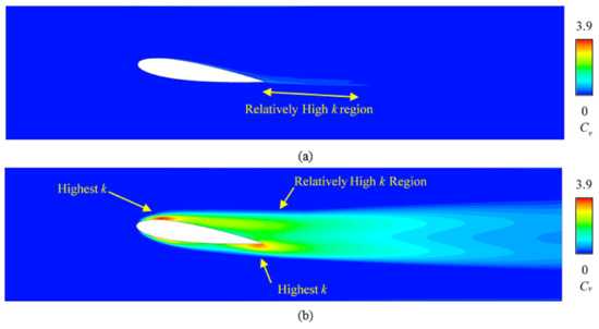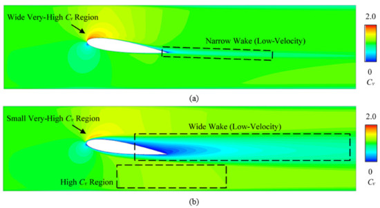 Figure 8 compares the velocity field on the X-Y plane at middle Z position in the domain. The velocity was relative to the domain-inlet velocity as a velocity coefficient Cv = V/Vin. The contours in the no-slip case and immersed-solid case were qualitatively similar but quantitatively different. The leading-edge high-velocity region was captured in the two cases. However, the very high Cv region (Cv > 1.5) was wide in the no-slip-wall case but small in the immersed-solid case, and its distribution was basically consistent with the distribution of the very low Cp region. The low velocity after the trailing edge (the wake) was narrow in the no-slip-wall case, but very wide in the immersed-solid case. A high Cv region was in the lower flow field, as indicated in Figure 8b. This shows that the immersed-method underestimates the flow velocity at the leading and trailing edges of the foil, and overestimates the flow velocity of the upper and lower flow fields of the foil.