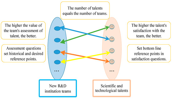 The match between the team of the new R&D institution and the scientific and technological talents in the first stage considers the team’s assessment of the talents and the cost of introducing talent, which is more in line with the actual situation. In the process of the team’s assessment of talent, the team’s personalized indicators, historical reference points, and desired reference points are taken into account so that the team’s psychological gain and loss can be obtained, and whether the team is satisfied, and the degree of satisfaction can be seen from the assessment prospect value. In the process of negotiating the introduction cost between the team and the talent, the bottom-line reference points of the new R&D organization are taken into account so that the gain and loss of the new R&D organization as a whole on the cost can be obtained, whether it is satisfied, and the degree of satisfaction from the cost prospect value. The prospect values of the combined benefits and costs of the team and talent were substituted into the M-1 model for bilateral matching and the matching results obtained were more convincing.