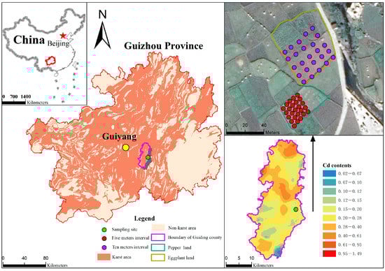 Some studies have pointed out that cadmium pollution exists in soils of 11 provinces and 25 regions in China [10], accounting for approximately 20% of China’s farmland soil area [11]. Cd pollution in soil should receive greater attention [12]. Guizhou province belongs to a geochemically anomalous area with respect to Cd, and the average content of Cd in soil is as high as 0.659 mg/kg, much higher than the average Cd content of cultivated soil (0.27 mg/kg) in China [13]. Due to the application of pesticides and chemical fertilizers, the probability of heavy metal accumulation in cultivated land is much higher than it is in general land use types [14]. Pepper, as an important agricultural product in Guizhou Province, poses the risk of Cd pollution in some areas [15]. Meanwhile, the content of heavy metals in eggplant, as a traditional crop, is positively correlated with the concentration of heavy metals in soil [16]. To ensure the safety of vegetables, it is necessary to employ effective and rapid methods to monitor the content of Cd in pepper and eggplant.