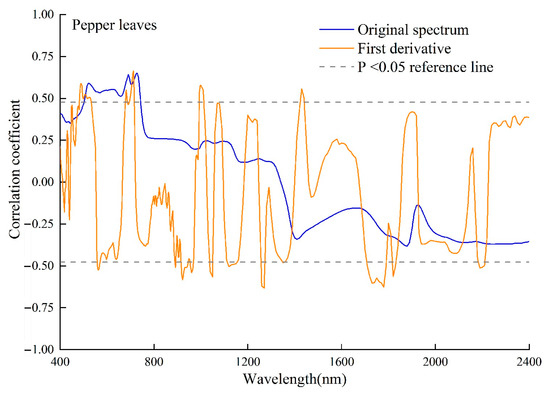 Correlation coefficient between the Cd content and the leaf spectra of the pepper.