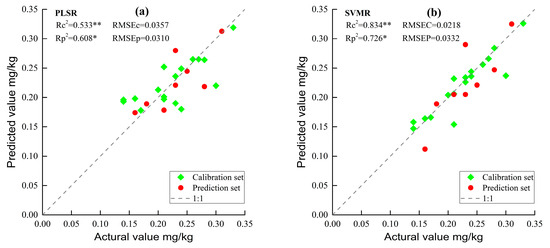Scatterplot of spectral prediction of the Cd content in pepper leaves by different models (first derivative). (a) Prediction results of PLSR model; (b) Prediction results of SVMR model. * Indicates the significance reaches the 0.05 level; ** indicates the significance reaches the 0.01 level.