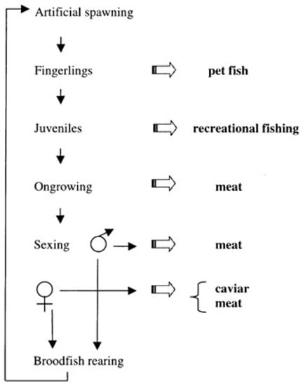 The farming of sturgeon, its processing resulting in products for the market in Western Europe as reviewed by Williot and co-authors [44] are shown in Figure 2 below.