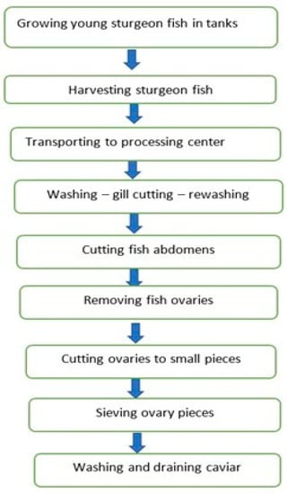 Commercial caviar growing and harvesting are now popular owing to overfishing in the wild. Sturgeon is globally raised to produce caviar by means of aquaculture. The flow diagram in Figure 3 depicts the processing of caviar from the sturgeon. The process is described in the Food Technology magazine published by the Institute of Food Technology, USA, as documented by McHugh below in 2020 [47].