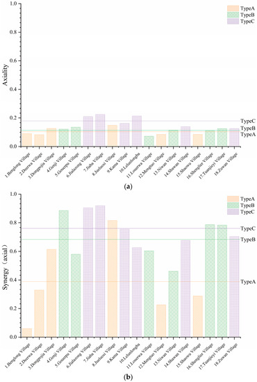 In sample comparison within Daofu villages, the sampled villages intersecting the urban expressway (Type C) and the sampled villages away from the urban expressway (Type B) had high synergy-axial mean values of 0.761 and 0.684, respectively, and the sampled villages adjacent to the urban expressway (Type A) had the synergy-axial mean value of 0.389 (the smallest).