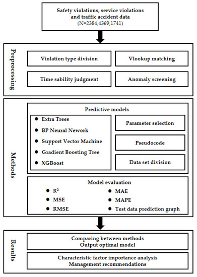 Consequently, this paper proposes a model for predicting the frequency of bus accidents based on safety violations and service violations, and reveals the degree of impact of each type of violation. The model with the best prediction effect is selected by comparing five machine learning prediction models with five indicators: goodness of fit, root mean square error, root means square error, average absolute error, and average absolute percentage error. Then, a prediction model is constructed using safety violation data. The new prediction model is compared to the model constructed with service violation data and safety violation data to determine whether the addition of service violation data significantly improves the prediction accuracy of the model.