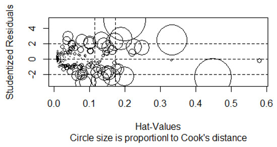 To reduce the influence of exceptional data points on the model, Rstudio software was applied to discriminate high leverage points, outliers, and strong influence points with hat diag H, student residual, and Cook’s distance (Cook’s D) as measures, respectively. Figure 2 shows the discriminant results.