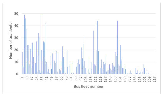 It can be seen from Figure 3 that there is a large variability in the number of traffic accidents by bus fleet, with 52 fleets having no accidents from January to June 2022, 64 fleets having up to and including five accidents, 41 fleets having more than five but not more than ten accidents and 34 fleets having more than ten accidents but not more than twenty. There were 28 fleets with more than twenty accidents. The highest number of accidents was 49, which occurred in numbers 6 and 34.