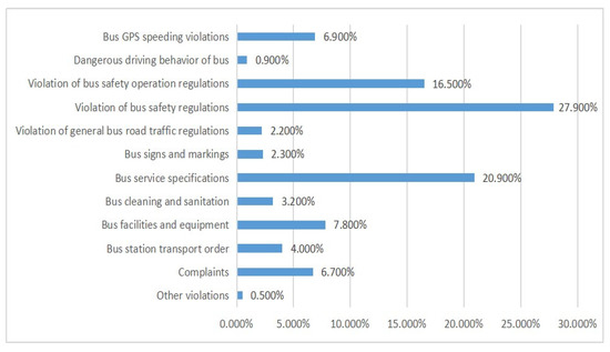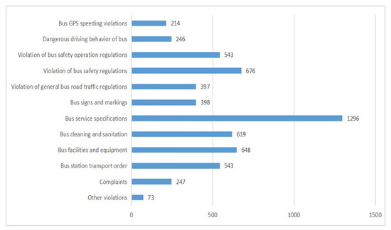 Safety violations consist of five categories including bus GPS speeding violations (), dangerous driving behavior of bus (), violation of bus safety operation regulations (), violation of bus safety regulations (), and violation of general bus road traffic regulations (). Furthermore, service violations consist of seven categories including bus signs and markings (), bus service specifications (), bus cleaning and sanitation (), bus facilities and equipment (), bus station transport order (), complaints (), and other violations (). Table 3 shows the specific violations for each violation type.
