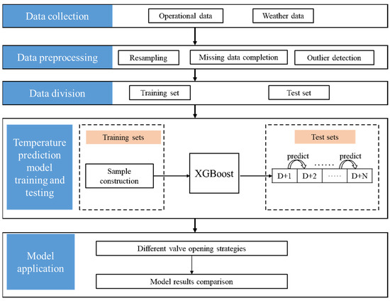 The research framework of this study is described in Figure 2, which includes five main processes. Firstly, a real DHS’s raw data, which included climatic information, was gathered. Then, the raw data were subjected to data preprocessing in order to fill in gaps and address outliers. After that, the test set and the train set are divided in the ratio of 2:8. Then, the integration model was developed to forecast the secondary loop temperature response. Further, the evaluation method, root mean square error (RMSE), was used to analyze the models using the test dataset.