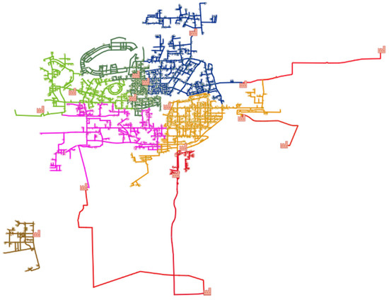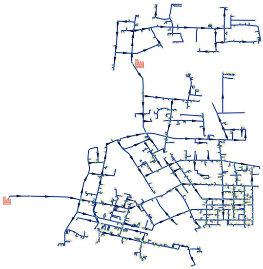 The experimental data included in this study was obtained from a real DHS in the Chinese city of Zhengzhou. The case study in this paper is a cooperation project with Zhengzhou Heat Group Co., Ltd., Zhengzhou, China. In this DHS, there are 20 heat sources, 4 peripheral power plants, 6 pressure isolation stations, and 10 gas boiler houses for heating in different areas. Regarding the heat network, there are 10 independent operational areas in the whole network during the heating season. The whole area of this heat network reaches 136,948,500 km2, and the actual supply area of this heat network achieves 115,553,750 km2. For the heating substations that have been put into operation, the number of heating substations covering the whole network is about 2962 or so. The area is in the very high heating supply stage, with a source heat supply of 31.715 million GJ, of which 19.7 million GJ or 62% is supplied by cogeneration, gas boiler houses supply 12.015 million GJ or 38%, and the total consumption of natural gas is 355.686 million m3. As shown in Figure 3, there are 8 branches under Zhengzhou Heat Group Co., Ltd. to manage the heat network area, respectively, which is used as the research object of this paper. A public building is heated by the heating substation selected and its secondary loop. The details of the topology diagram structure in the northern direction of Figure 3 have been shown in Figure 4. In Figure 3, the different districts are represented by lines with different colors and the lines represent the pipework of primary loop in DHS. In Figure 4, a district pipework with two heat sources is indicated.