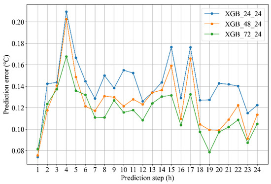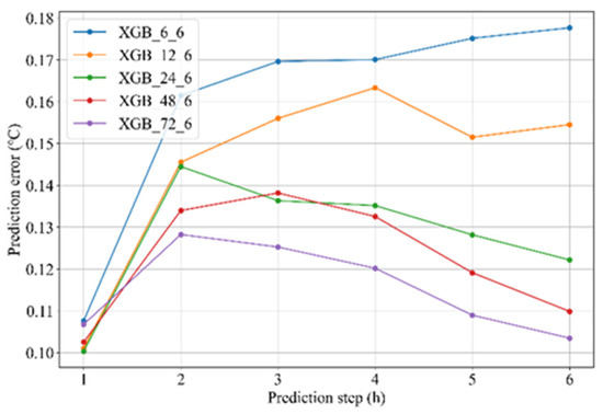 As Table 3 shows, the average prediction error of the XGBoost model decreases with the input step size increasing, when viewed from the perspective of the input step size. Take the prediction step size of 6 as an example: the average prediction errors when the input step sizes are 6, 12, 24, 48, and 72 reach 0.162, 0.147, 0.129, 0.123, and 0.116, respectively. The same goes for the prediction step size of 12 or 24. That means that for the scenario where the XGBoost model is used to forecast the temperature of the secondary loop supply water, the longer the input steps included in the samples (within 72 steps), the higher the accuracy of the prediction. The reason for this result is that the XGBoost model performs well on information extraction through the integration of multiple predictors. When the input step is longer, which means that more historical information is included, XGBoost can effectively extract more helpful information to improve prediction performance.