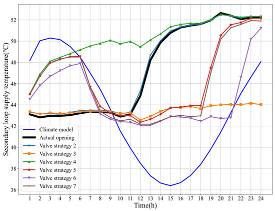 The following are the three strategies, corresponding to valve strategy #1, valve strategy #2, and valve strategy #3, respectively, observing different valve control plans. First of all, it can be seen that the temperature prediction curve for valve strategy #1 is the same as the temperature response curve under the actual control plan. In the 24-h comparison of the predicted temperature response and the actual temperature response, the maximum prediction error of the model is 0.47 °C, the minimum prediction error is 0.01 °C, and the average prediction error is 0.17 °C, which verified the accuracy and reliability of the temperature response model. Secondly, valve strategy #2 is to maintain the valve opening 15% of the previous day unchanged, and the secondary loop supply temperature in the next 24 h is maintained at 43–44 °C. Finally, valve strategy #3 is to directly increase the valve opening from 15% to 20% and maintain this opening. It can be concluded that the corresponding temperature response curve gradually rises from around 45 °C and finally stabilizes at around 52 °C.
