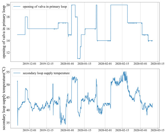 The secondary loop supply temperature and the opening of valve changes in the experimental heating substation during the heating season of 2019–2020 are described in Figure 9 to analyze the failure of the temperature prediction response model with extreme conditions. Most of the time, the secondary loop supply temperature is above 40 °C, except from 28 December to 31 December when the secondary loop supply temperature is around 36 °C. In addition, as shown in Figure 9, it can be found that the valve opening of heating substation during 2019–2020 heating season ranges from 11% to 20%, and the valve opening range is basically maintained at 14% to 20%. The principle of machine learning is learning the internal relationships and laws from existing historical samples. However, for the training samples, the valve opening and the secondary loop supply temperature are rarely less than 14% and 40 °C, and there is even no condition where the valve opening is less than 10%. Considering the working conditions of the previous day and the future weather forecast, the reason for the failure in model response valve strategy #6 is that the high-dimensional sample space contained in the model has been exceeded during training.