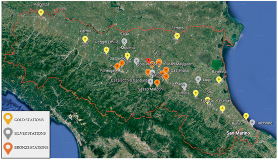 The Emilia-Romagna region is located in the northern part of Italy with a population of 4,459,866 in 2021 [42]. The region borders Lombardy, Veneto, Piedmont, Liguria, Tuscany, Marche and the Republic of San Marino, while the eastern side overlooks the Adriatic Sea. Due to its geographical and historical features, the region is a tourist attraction and offers a multitude of job opportunities. In 2021, the Emilia-Romagna region hosted more than 30 million tourists, some of them travelling within the cities, attracted by business trips or spa facilities [43]. The presence of the Apennines and of the hills attracts tourists for outdoor activities as well. Moreover, the Emilia-Romagna region, characterized by the coast of the Adriatic Sea, reaches the highest share of tourists in this area during the summer thanks to equipped beaches and activities involving different age groups. These data show the importance of movements between different localities inside the region, which also depend on the season of the year. The Po Valley is also part of the Emilia-Romagna region. Crossed by the river Po, the main Italian river, this is historically one of the most important industrial areas of northern Italy. This leads to a substantial movement of commuters who need to move exclusively for work reasons to areas far from their households. The railway station infrastructure, as a mobility hub, is therefore of great importance and must include all the facilities necessary to reach the place of interest in the easiest and most sustainable way possible, without excluding bicycles. To give priority to interventions, the following method has been developed.