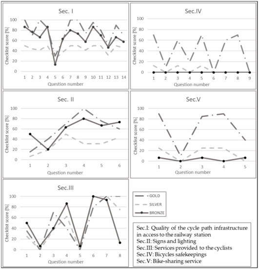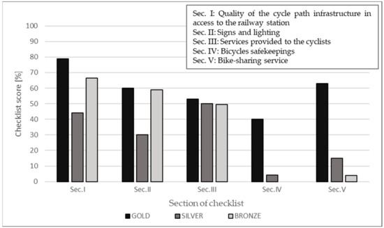 Compared to the other categories, the silver and bronze railway stations are mostly lacking in bicycle safekeeping services (“Sec.IV”). The mostly unfinished category, and therefore, to be implemented for bronze and silver railway stations, is “Sec.V”, which shows the rare presence and low quality of the bike-sharing service. The most performing section in silver railway stations includes services provided to the cyclists. However, they reach only 70%. “Sec.I” and “Sec.II” are rated below 50% in silver train stations. On the contrary, “Sec.I” and “Sec.III” are the most performing sections in bronze railway stations, with a small difference between the two of 66% and 63%, respectively. Finally, Figure 4 shows that the score of “Sec.III” does not differ much among the three gold, silver and bronze categories, respectively, 71%, 66% and 63%.