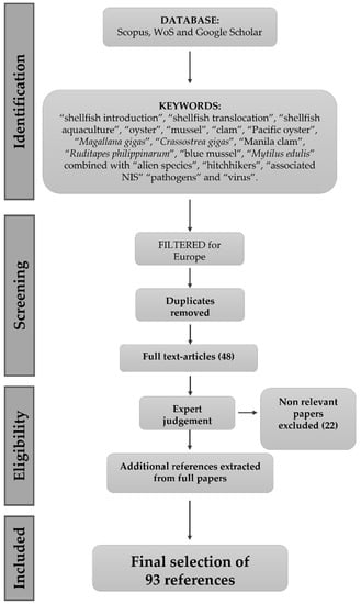 The scientific research was restricted to the following time span: January 2000–May 2022. The topics and/or keywords used for the research were: “shellfish introduction”, “shellfish translocation”, “shellfish aquaculture”, “oyster”, “mussel”, “clam”, “Pacific oyster”, “Magallana gigas”, “Crassostrea gigas”, “Manila clam”, “Ruditapes philippinarum”, “blue mussel”, “Mytilus edulis”, combined with “alien species”, “hitchhikers”, “associated NIS”, “pathogens” and “virus”. Considering that the WoRMS (see details in the introduction section) adopted M. gigas as the species name back in 2016, we also decided to use it for bibliographic research.