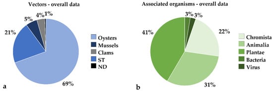 (a) Pie chart presenting the overall data on main vectors involved in alien species introduction and spread: oysters, mussels; clams; ST = shellfish transfer; ND = natural dispersal. (b) Pie chart presenting the overall data on alien species associated with bivalve aquaculture, divided into five main groups: Chromista; Animalia; Plantae; Bacteria and Viruses. Data are expressed as percentages.