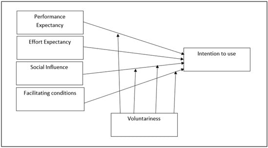 Voluntariness to use refers to the use of technology or online platforms being perceived as free will [50]. Voluntariness is a dominant influence on user behavior [42,47,51]. Voluntariness is the extent to which potential adopters perceive the adoption as not mandatory. Voluntariness determines other factors that influence the user’s behavior. Voluntariness is the context where the user will accept technology without any influence. This was used by the authors of [41] as a moderator, and the study revealed that technology adoption was significantly increased from 35% without a moderator to 55% with a moderator. In this study, this construct was used as moderating variable to see the influence of voluntariness in the online system on performance expectancy, effort expectancy, social influence, and facilitating conditions.