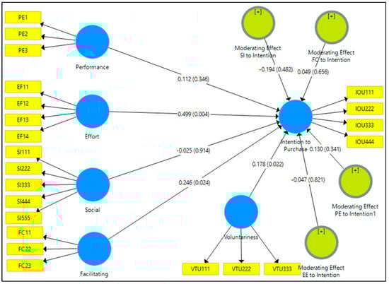 In order to assess the significance of path coefficients and test the moderation effects of the moderator, bootstrapping with a resample of 5000 was performed. The authors of [56] stated that the t-value must be considered in order to determine the significance of the relationship. The standardized beta (β) values and related t-values were checked. Ref. [56] shows a significant link using a t-value greater than 1.96 or a p-value less than 0.05. In this study, the first hypothesis, H1, examined the relationship between performance expectancy and the intention to use. The t-value was lower than 1.96, and the p-value was greater than 0.05, signifying an insignificant relationship. The second hypothesis, H2, examined the relationship between effort expectancy and the intention to use. The t-value was higher than 1.96, and the p-value was lower than 0.05, signifying a positive and significant relationship. The third hypothesis, H3, examined the relationship between social influence and the intention to use. The t-value was lower than 1.96, and the p-value was higher than 0.05, signifying an insignificant relationship. The fourth hypothesis, H4, examined the relationship between facilitating conditions and the intention to use. The t-value was higher than 1.96, and the p-value was lower than 0.05, signifying a positive and significant relationship. Therefore, only hypotheses H2 and H4 were supported, and H1 and H3 were not supported.