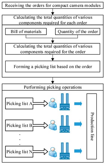 Figure 1 illustrates the as-is picking operation model for compact camera modules. When a manufacturer receives a customer’s order, the quantities required for various components are calculated by using the bill of materials (BOMs) in accordance with the specification and the order quantity of the customized compact camera modules. A warehouse picker is responsible for a customer order and performs the picking operation on the basis of the total number of components as indicated by the picking list. When N picking lists are created, the times that the electric order-picking trucks enter the warehouse is N to cause more carbon emissions during the picking operation process. In addition, if the warehouse picker receives multiple picking lists in which the components to be picked up are stored in significantly different locations within the warehouse, the warehouse picker must travel long distances with the electric order-picking truck to pick the required components, thereby increasing energy consumption. The as-is picking operation model does not perform clustering analysis on the basis of the types of components to be picked up for each picking list and combines picking lists with high similarities to pick them simultaneously. Furthermore, the picking lists within the same cluster must be optimally assigned to improve picking efficiency and reduce the carbon emissions of picking activities. To solve the aforementioned problems, this study applies the K-means clustering algorithm and Prim’s minimum spanning tree algorithm to develop a sustainable warehouse operation methodology for optimizing picking-list consolidation and assignment.