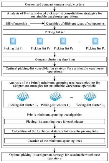 The rapid growth of the consumer electronics market has led to an increase in the carbon emissions generated by warehouse operations in supply chains. To our knowledge, few academic papers simultaneously consider picking-list consolidation and assignment. To build a sustainable supply chain, this study focused on the picking operations of a supply chain and develops an optimal picking-list consolidation and assignment methodology for sustainable warehouse operations that were based on K-means clustering and Prim’s minimum spanning tree. To verify the effectiveness of this methodology, it was applied to the assembly of compact camera modules to compare the difference in the carbon emissions for the as-is model and the to-be model. Because compact camera modules are customized products, the types and specifications of components required are based on the needs of the customers. Therefore, different parts are picked for different picking lists, which considerably limits picking efficiency and leads to the high energy consumption of the electric order-picking truck. Given the aforementioned factors, the first stage of the proposed methodology applied the K-means clustering method to merge multiple picking lists with similar components, thereby establishing the optimal picking-list consolidation strategy for sustainable warehouse management. On the basis of the analysis results obtained during the first stage of the methodology, the second stage links the picking lists in each cluster that are most similar by applying Prim’s minimum spanning tree algorithm to create a graph comprising the minimum spanning tree. This step ensures that each warehouse picker is assigned the most similar picking lists to create a balanced work assignment.
