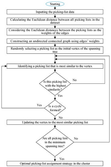 In this study, Prim’s minimum spanning tree algorithm was applied to optimize the clustering results of the proposed K-means clustering method and to develop the optimal picking-list assignment strategy for implementing sustainable warehouse operations. This method involves connecting the edges with the shortest distance between each data point to find the minimum distance path in a graph. Specifically, the most similar picking lists in each cluster were linked to enable a manager to assign the most similar picking lists to a warehouse picker, thereby achieving the optimal picking-list assignment.