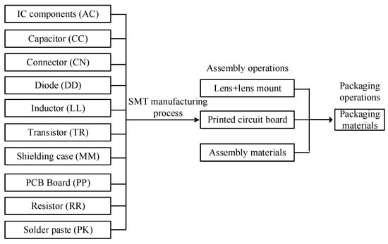 This study used the compact camera modules produced by Company H as an example to verify the efficacy of the proposed methodology. The picking list information provided by Company H mainly comprised the order quantities and bill of materials for compact camera modules. Table 2 lists the compact camera modules manufactured by Company H and the order numbers that correspond to the product names. The customer orders and bills of materials provided by Company H can be converted to picking lists. This picking list specifies the quantities of the required components (e.g., integrated circuit, capacitor, connector, diode, and inductor) that a warehouse picker must pick up from the warehouse and then transferred to the production line so as to fulfill the assembly of the 5-megapixel autofocus compact camera modules for Order No. 16. This study examined 102 picking lists of compact camera modules that list a total of 24,613 components. Figure 4 shows the components required for the assembly process for Order No. 16.