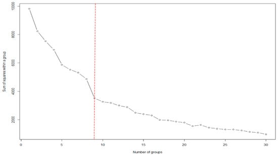 When the types of components as specified by the picking list were obtained, the K-means clustering method was applied to analyze the picking-list clustering. Figure 5 illustrates the total within-group variances of the optimal clustering for various numbers of clusters, and it reveals that the within-group variance decreased when the number of clusters (K value) increased. When K = 9, the total within-cluster variances decreased considerably but tended to converge thereafter. Therefore, in this study, the optimal picking-list consolidation strategy for sustainable warehouse operations was determined to involve nine clusters as shown in Table 3. At this time, a warehouse picker could simultaneously pick multiple picking lists with high similarity; this enables the warehouse workers to reduce the picking distance to avoid excessive energy consumption by electric order-picking trucks.