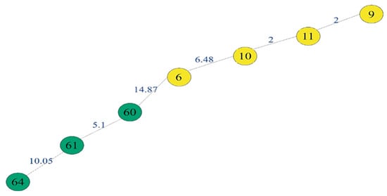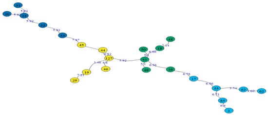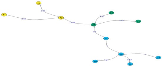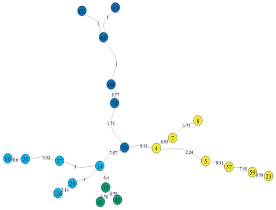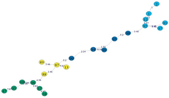 The element aij in an adjacency matrix represents the distance between picking lists i and j. On the basis of the K-means clustering results, we constructed the spanning trees of the first to ninth clusters to find the minimum spanning trees. Prim’s minimum spanning tree algorithm was applied to find the shortest linkage distances for all picking lists to form a minimum spanning tree. Because the numbers of picking lists for the sixth to ninth clusters were small, the results for these clusters did not require further analysis and were assigned directly. Therefore, the first five clusters were analyzed subsequently, and the minimum spanning trees were identified, as shown in Figure 6, Figure 7, Figure 8, Figure 9 and Figure 10.