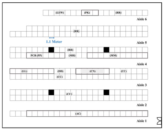 Figure 11 illustrates the layout of Company H’s warehouse for storing various components on storage racks; the area illustrated in this figure comprises six aisles, and the solid black area represents the beams of a building. In this study, each component was assumed to have a dedicated storage location. The lower right section in Figure 11 displays the warehouse entrance and exit. A warehouse picker uses this position as the starting and ending points of each picking path. The carbon emission generated on the basis of the distance traveled by the electric order-picking truck was used to perform a performance evaluation, during which the differences between the performance of the as-is and to-be models were identified. Table 5 reveals that in the as-is model, the electric order-picking truck traveled a total of 693.3 m. By contrast, the electric order-picking truck traveled 227.2 m in the to-be model. That is, the to-be model increased pickup efficiency by reducing the distance by the electric order-picking truck by 466.1 m. For every 1 m of distance traveled, an electric order-picking truck consumes 6 watts of electricity. According to the Bureau of Energy in Taiwan [20], 0.502 kg of CO2 emissions per watt. Therefore, the to-be model reduced carbon emissions (CO2 e) by 233.9 kg.