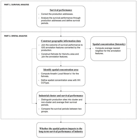 The research framework of this study consists of two parts (see Figure 3). The first part investigates the survival performance of production sites, and the second part further takes spatial factors into account to discuss the relationships between survival and spatial patterns. The methodology mainly employs functions from Excel and spatial analysis tools from geographic information systems, including the average nearest neighbor analysis and a cluster and outlier analysis.
