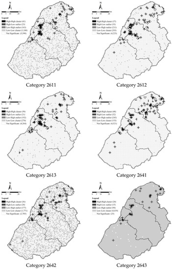 According to the spatial analysis (see Table 2 and Figure 4), there are 232 HH fishnets for the semiconductor industry in the Hsinchu area. Category 2613 has 50 HH fishnets and represents the highest, category 2641 has 48 HH fishnets and is the second highest and category 2611 has 41 HH fishnets and is the third highest. As for the cluster number, the total number is 58. Category 2641 has 16 clusters and is the highest, category 2613 has 13 clusters and is the second highest and categories 2612 and 2642 have 9 clusters and are the third highest. In terms of cluster size, the average size for all clusters is 4.27 fishnets. Category 2611 has the largest average cluster size of 6.83, category 2612 has the second largest average cluster size of 4.11 and category 2642 has the third largest average cluster size of 4.00.