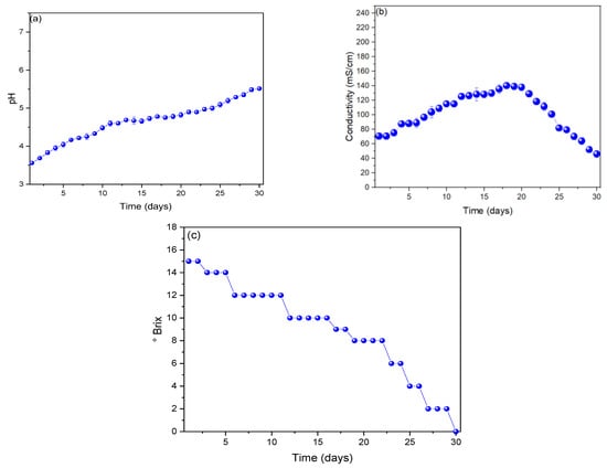Figure 3a shows the monitored pH values during the 30 days; it was observed that the values remain in the slightly acidic region, with the optimum operating pH of 4.78 ± 0.46 on the seventeenth day. The pH values increased during monitoring due to the fermentation of the substrate used, which according to Igboamalu et al. (2019), all MFCs have a saturation potential that depend directly on the pH because the consortium of microorganisms that can exist within a substrate needs a suitable pH for growth [40]. Although investigations have been reported that have managed to generate electrical values with neutral or basic pH, the values obtained by our investigation are among the highest shown (without adding chemical compounds to the substrate). For example, Prasidha W. (2020) works their MFCs at a pH of 7.1 using food waste leachate as a substrate, managing to generate voltage peaks of 410 mV [41]. Likewise, Figure 3b shows the values of electrical conductivity, where the values increase from the first day (70.46 ± 1.73 mS/cm) to day 18 (140.07 ± 3.51 mS/cm) and then decrease slowly until the last day (45.98 ± 4.51 mS/cm). The increase in electrical conductivity values is due to the low electrical resistance of the substrate used, while these values begin to decline due to the sedimentation of organic compounds present in the waste used [42,43]. Substrate masses have also been reported to have a dependence on electrical conductivity According to Kalagbor et al. (2020), this relationship is directly proportional because in their research, the masses increased from 1 to 12 Kg and their electrical conductivity values increased from 787.6 ± 475.89 to 1282.9 ± 492.94 mS/cm. Said increases were also represented by the values of voltage and electric current [44]. In Figure 3c, the ° Brix values monitored for 30 days are shown, and it can be observed that they gradually declined from the third day (14° Brix) until the last day (0° Brix). Tangerine is a fruit that is composed of almost 76% moisture and 24% soluble solids (such as sugar-fructose and glucose) [45], which are precisely the rich sources of carbons that microorganisms use for their growth [46]; this would be one of the important characteristics of the decrease in the Brix degree values in the bioelectricity generation process [47].