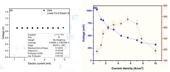 Values of (a) voltage and (b) electrical current of microbial fuel cells.