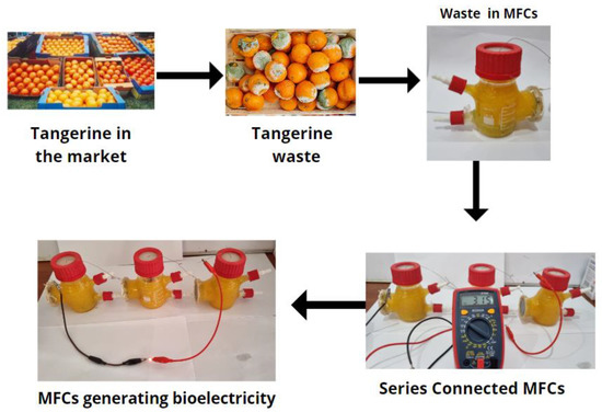 Fruit waste has increased exponentially worldwide, within which tangerine is one of those that generates a greater amount of organic waste, which is currently not fully used. On the other hand, microbial fuel cells (MFCs) are presented as an opportunity to take advantage of organic waste to generate electricity, which is why the main objective of this research is to generate bioelectricity using tangerine waste as a substrate in microbial fuel cells using zinc and copper electrodes. It was possible to generate current and voltage peaks of 1.43973 ± 0.05568 mA and 1.191 ± 0.035 V on days eighteen and seventeen, respectively, operating with an optimum pH of 4.78 ± 0.46 and with electrical conductivity of the substrate of 140.07 ± 3.51 mS/cm, while the Brix degrees gradually decreased until the last day. The internal resistance determined was 65.378 ± 1.967 Ω, while the maximum power density was 475.32 ± 24.56 mW/cm2 at a current density of 5.539 A/cm2 with a peak voltage of 1024.12 ± 25.16 mV. The bacterium (Serratia fonticola) and yeasts (Rhodotorula mucilaginosa) were identified in the substrate with an identity of 99.57 and 99.50%, respectively. Finally, the cells were connected in series, managing to generate 3.15 V, which allowed the turning on of a red LED light.