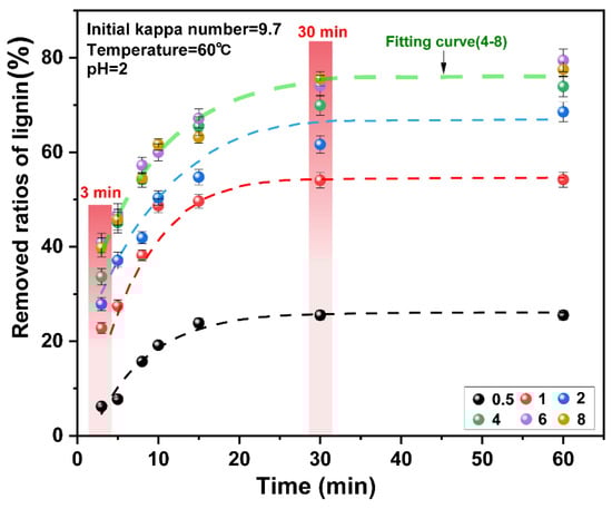 The initial 0–3 min was the initial delignification stage of chlorine dioxide. When the chlorine dioxide/lignin mass ratio was increased from 0.5 to 4, the ratios of lignin removed increased from 12.97% to 33.66%. On further increase of the consumption of chlorine dioxide, the ratios of lignin removed did not change significantly. The mass ratio of chlorine dioxide/lignin in the system reached “saturation.” In the initial stages of the reaction, the ratios of lignin removed increased with the increase in the chlorine dioxide/lignin mass ratio. This indicated that the removal of lignin at the initial stage of the reaction corresponded to the residual lignin content and the amount of chlorine dioxide in the pulp. This was consistent with the previous findings on chlorine dioxide delignification [,]. The ratios of lignin removed was related to the amount of residual lignin in the pulp. As the reaction proceeds under the oxidation of chlorine dioxide, the amount of lignin in the pulp decreases rapidly, so the ratios of lignin removed also decreases at a rapid rate [,].