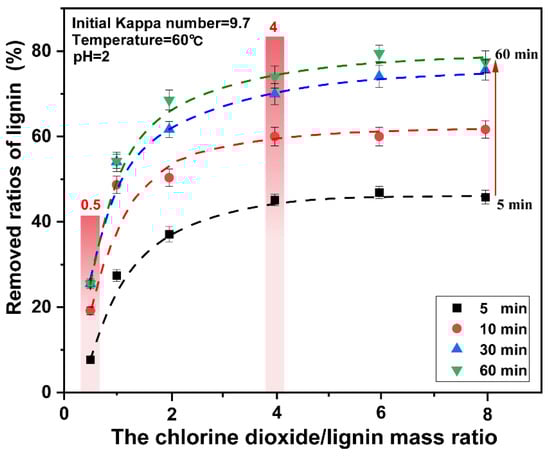 Effect of chlorine dioxide/lignin mass ratio on the removed ratios of lignin from pulp under different reaction times.