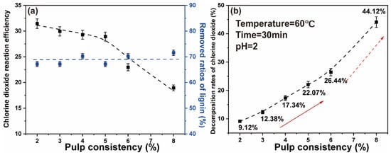 The results showed that at low pulp consistency, the ratios of lignin removed were not affected. The decomposition of chlorine dioxide was reduced, thus increasing the reaction efficiency of chlorine dioxide. The results are shown in Figure 4a. When the pulp consistency was 5–8%, the chlorine dioxide efficiency increased with the decrease of pulp consistency. When the pulp consistency was lower than 5%, the chlorine dioxide reaction efficiency did not change significantly. Hence, the higher the pulp consistency, the higher the chlorine dioxide concentration was in the reaction system. Figure 4b shows that the decomposition rates of chlorine dioxide gradually increased with the increase of the pulp consistency. When the pulp consistency was 2%, the decomposition rates were the lowest, 9.12%. When the pulp consistency was increased to 8%, the decomposition rates of chlorine dioxide finally reached 44.12%. This may be due to the solubility of a high proportion of chlorine dioxide solution that was affected by temperature, where the chlorine dioxide molecules decompose and escape at high temperature. On the assumption that there would be considerable water consumption during the reduction of the pulp consistency, a pulp consistency of 5% has the best and guaranteed effect of chlorine dioxide bleaching efficiency.