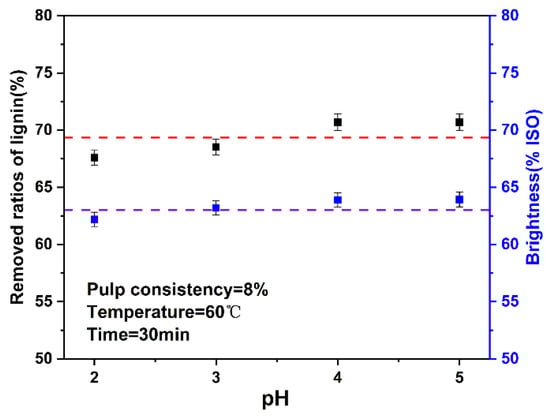 In the traditional chlorine dioxide bleaching research, pH has a great influence. Under alkaline conditions, chlorine dioxide reacts with OH− to generate chlorate ions and chlorite ions, which weaken the bleaching effect of chlorine dioxide. Generally, the optimal range of pH at the end of bleaching is 3.5–4.0 []. In this study, the pH in the system was changed by changing the amount of chlorine dioxide and pulp consistency in the system. Therefore, this experiment explored the influence of pH on the high proportion of chlorine dioxide bleaching system. The results are shown in Figure 5. The final data are the average of three parallel experiments.
