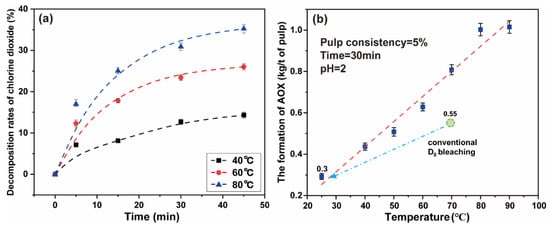 It can be observed from Figure 6b that the formation of AOX increases with the increase in reaction temperature. When the temperature was 25 °C, the formation of AOX was 0.29 kg/t of pulp. If the temperature continues to increase, the formation of AOX rapidly increased. When the temperature reached 80 °C, the formation of generated AOX reached the highest value, which was 1.00 kg/t of pulp. Under low temperature conditions, the high proportion of chlorine dioxide bleaching system inhibits the formation of AOX (below 0.30 kg/t of pulp), which may originate from the accelerated oxidation of chlorine dioxide and the inhibition of the chlorinated substitution reaction []. The new system can reduce AOX to about 0.3 kg/t of pulp, which is 45% lower than conventional D0 bleaching. The low temperature greatly reduced the side reactions in the bleaching process, thus the amount of AOX was much less. It is completely feasible to adopt a low temperature strategy for the high proportion of chlorine dioxide bleaching system.