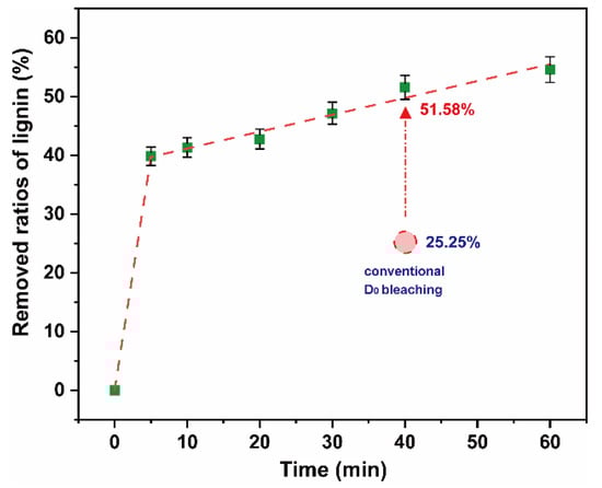 To reduce the consumption of chlorine dioxide and the formation of AOX, this study experimented on lignin removal of a high proportion of chlorine dioxide bleaching system under 25 °C and low pulp consistency. Chlorine dioxide was added into the polythene sealed bag containing the pulp to ensure the chlorine dioxide/lignin mass ratio in the system was 4. The pulp consistency was adjusted to 5%, and the bag was placed in a thermostatic water bath at 25 °C. The reaction time was in a range of 0–60 min. The results are shown in Figure 7. The final data are the average of three parallel experiments.