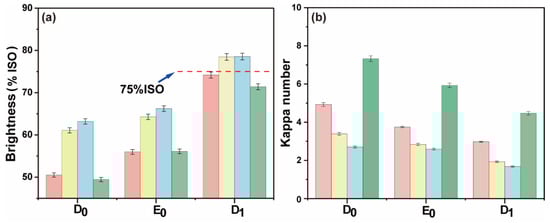 (a) Brightness comparison between DPI-D0E0D1 and conventional bleaching; (b) the kappa number comparison between DPI-D0E0D1 and conventional bleaching (red: D0 chlorine dioxide consumption 0.00%, yellow: D0 chlorine dioxide consumption 0.50%, blue: D0 chlorine dioxide consumption 0.75%, green: conventional chlorine dioxide bleaching).