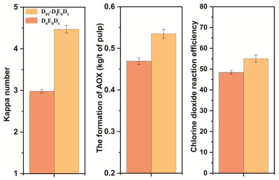 The amount of chlorine dioxide in the D0 stage had an effect on the final kappa number and brightness of pulp. The final bleaching effect is shown in Figure 9. The final data are the average of three parallel experiments. The final kappa number was reduced to ~2.0, and the brightness was ~75% ISO. Without adding chlorine dioxide in the D0 section, the brightness of the pulp after DPI-D0E0D1 bleaching reached the same amount as that of the pulp after conventional chlorine dioxide bleaching. The formation of AOX was lower than that of conventional bleaching. However, its chlorine dioxide efficiency was also calculated to be slightly lower than that of conventional bleaching. The bleaching results are shown in Figure 9. To summarize, it was feasible to combine the DPI pulp with the D0 stage of direct heat treatment and the conventional chlorine dioxide bleaching E0 and D1 stages.