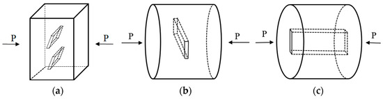 Schematics of specimens with different flaw configurations: (a) the dynamic loading direction is perpendicular to the flaw direction and intersects with the flaw inclination; (b) the dynamic loading direction is perpendicular to the flaw direction and inclination; (c) the dynamic loading direction is parallel to the flaw trend and perpendicular to the flaw inclination.
