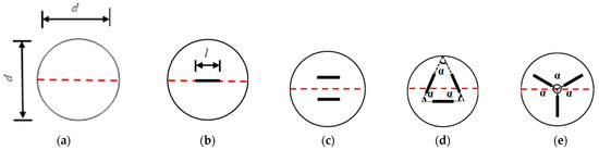 The dynamic impact perpendicular to the trend of the cracks has been comprehensively investigated (Figure 1a,b). However, few studies have been conducted on the conditions when dynamic stresses are parallel to the trend of the cracks. Wu et al. [38] examined the effect of axial surface cracks on rock dynamic mechanical properties and failure modes, and found that dynamic compressive strength, deformation modulus, and peak strain of specimens increase initially and then decrease with the increase of crack number and crack depth. The fragmentation degree of the samples with double cracks was greater than that of the samples with other cracks. Therefore, the axial surface crack parallel to the loading direction is of significant importance for mechanical properties and failure modes. It is important to study the dynamic mechanical properties and failure modes of rock under the condition that the trend of pre-flawed samples is parallel to the impact loading direction.